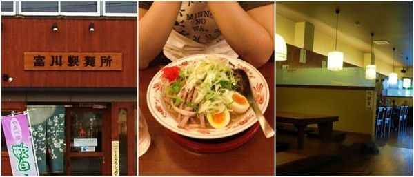 18:07 晚餐在 富川製麺所 (とみかわせいめんしょ)解决。由于前一晚夜里已经探过路,所以非常好找。这家支店于2009年4月开张,生产的面条均用北海道产的面粉。下图中是北海道限定中华冷面[850yen],汤汁酸酸甜甜辣辣带着芝麻,属于重口味系列。一碗面就着三杯冰水,爽到心。