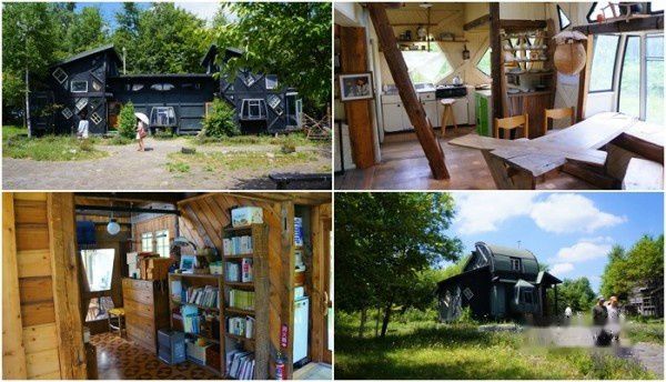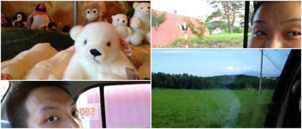 12:20 第一站是“北国”捡来的家(拾って来た家)。剧集“北国”(北の国から)的完结篇“遗言”的主要场景。黑板五郎(ごろくろいた)用废弃的材料和垃圾重新利用搭建的房舍。从大件的公共汽车、公用电话亭、登山小缆车及小件的鸡蛋包装盒,酒瓶子等。虽然没有看过这部剧集,但屋内的创意还是让人不由发出惊讶的叹息。捡来的家单独卖票的,[300yen/人]。下车前导游将上车的时间写在小白板上请大家注意时间。下车时也端着时间告示板恭候各位游客下车。这里的卖店生意相当好,关于北国的明信片、书籍等。