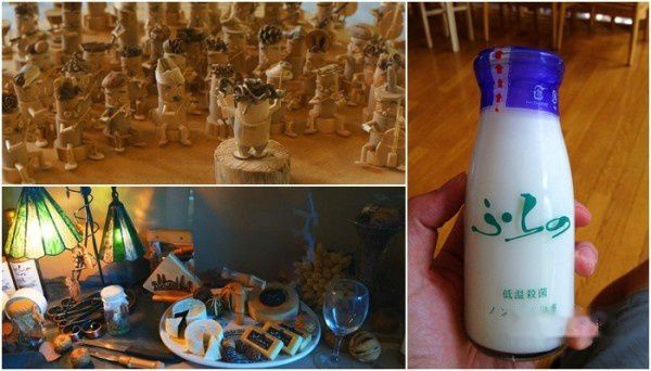 14:18 从面包超人专卖店出来,接下来继续上车来到富良野起司工房(富良野チーズ工房)。半个小时车程。这里可以参观起司的制作过程、品尝各种口味的起司之外,游客还可以报名亲自体验制作的乐趣。时间关系,我们只能作罢。在2楼买了富良野牛乳(ふらの牛乳)解解馋[130yen]。门口的橱窗里摆放着著名的交响乐团木工作品,每个人物的造型和乐器还真不一样,肢体生动、表情细腻,非常吸引人。这件作品出自于森之精灵的艺术家。
