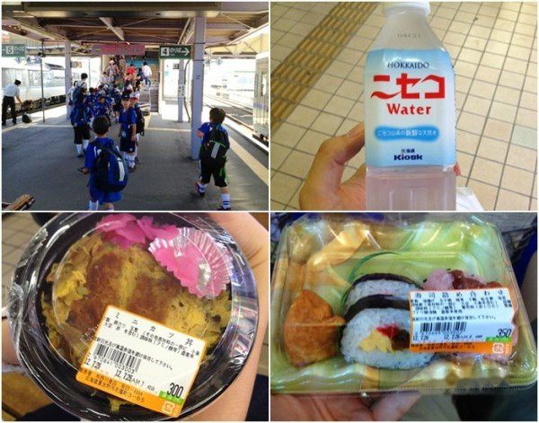 7:12在车站的Kiosk便利店买了早餐,金枪鱼鸡蛋三明治(タマゴ&ツナサンド)[155yen]、猪排火腿色拉三明治(ハムカツ&サラダサンド)[190yen] 以及可口可乐公司出品的灌装乔治原味咖啡(ジョージアオリジナル)[120yen]。找了候车室长凳子,一边吃着可以一边看电视。车快到了,站内的人也渐渐多了起来。卖荞麦面的大婶忙碌地招待着顾客,几位年长的顾客看来对一款生鸡蛋荞麦面情有独钟。由于人多他们没有座位,仍然端着碗吃,呼噜呼噜地在吃。专注的吃面神情,让人看着就香,以至于计划晚上回来或者明天早上经过车站的时候来吃上一碗。搭早班车的以学生居多,还有一支少年足球队, 7-8岁的模样,全副武装,非常专业,和他们的成年国家队一样身披蓝衣。时间差不多了,应该过天桥去站台准备上车了。