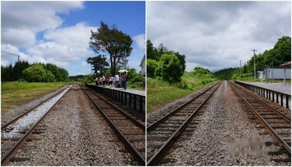 车站的候车室小,聚集的人越来越多,显得有些闷热。去站台等车吧,没有步道桥(我们叫天桥),所以直接穿过铁道,去往对面的站台等车。站在路轨中央,左图是上行开往旭川,右图是下行开往富良野。所站的位置仿佛正好是两种天气的分割点。
