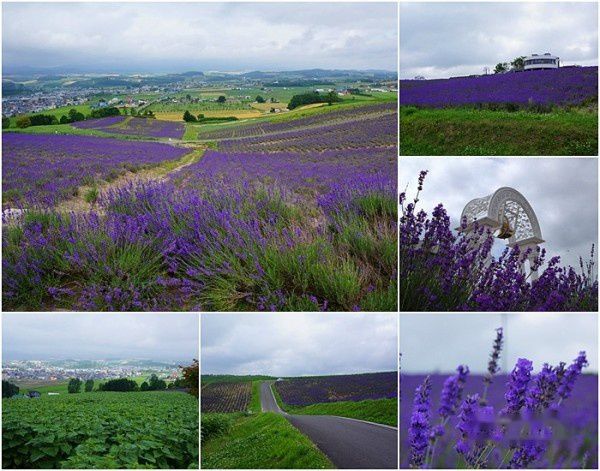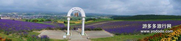 9:01 在公园内还有一个“薰衣草始发地”的标志,位于观景台侧面不远处。圆柱形的观景台共有三层。二层是个小卖店,贩卖着各种各样都不重样的纪念品,和薰衣草制品。从枕头、T恤、钥匙扣、零食、手帕、肥皂、干花、精油、钥匙扣、明信片、书籍、扇子、冰淇淋……店员是位老妈妈,一个人负责打理着这间铺子。走上三楼,瞬间视野开阔、风光旖旎。不但可以将富良野盆地和周围的十胜连峰景观尽收眼底,此外,丘陵坡顶还有一座“爱之钟”,与爱人一同拉响,据说就会得到幸福。