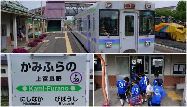 7:43 列车经过学田、鹿討、中富良野、西中之后,抵达 上富良野駅 (かみふらのえき)。跟随着少年足球队一块下车。每个小队员脸上都非常认真的样子,真让人敬佩。