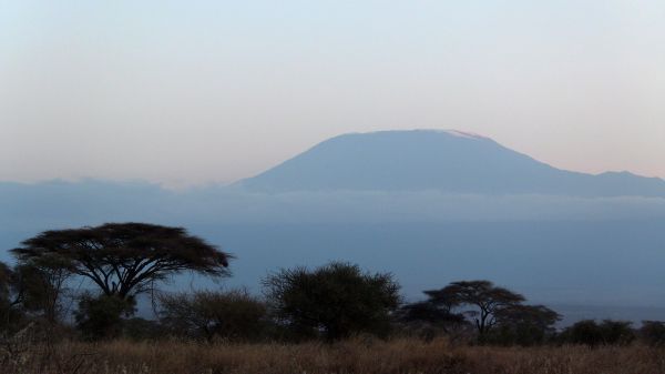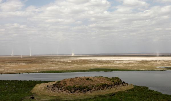 安博塞利国家公园内有个游客可以下车爬山的地方,5分钟可以爬上小山,山下是中央湿地,天气好的时候可以看见乞力马扎罗山和和坦桑尼亚的梅鲁山。我们来时是旱季,只在湿地中央有可怜的绿色,延绵不尽的是月白色半沙漠,放眼望去只见缕缕的龙卷风从干枯的湖上腾空而起,安博塞利草原尽显苍凉。