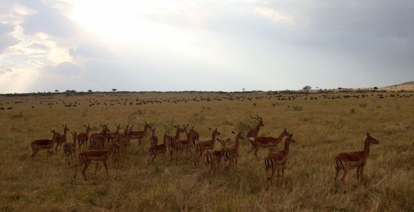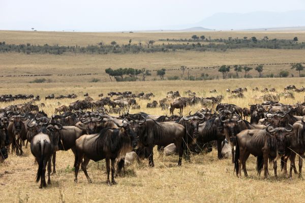 马拉河边成千上万只正在迁徙的角马。小树后面和上面羚羊后面那条黑线都是正在迁徙的角马。
