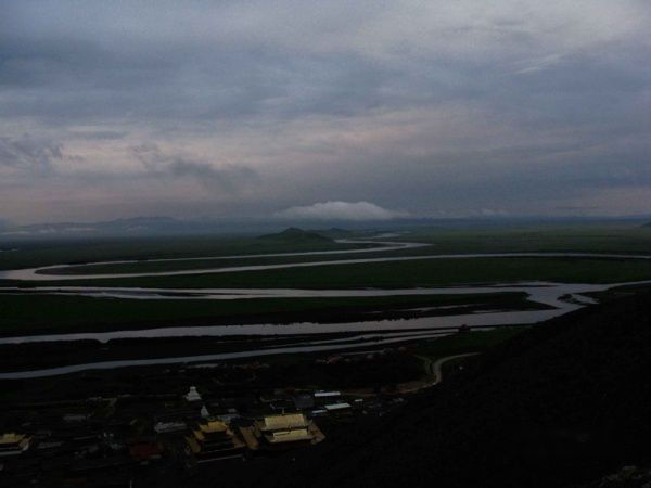 之前在唐克打听到,景区在河边原来有个营地,专门提供给游人扎营,这可是个好消息,刚从年保玉则露营归来,我可是帐篷睡袋装备齐全啊!于是决定当晚就留在景区扎营。营地离售票处很近,让人惊喜的是营地是有人管理的,有商店、客房和洗手间,大厅还有电视看,实在是玩户外以来的第一次。因为是周末,这天有不少游客也参加到安营扎寨的行列中来,场面一点都不寂寞。我把帐篷扎在房子的二楼走廊,搬来桌子和椅子,随后开始动手做饭,有了前几天露营的经验,架炉、起锅、下面,煮肉,很快就做好了一碗香喷喷、真材实料的牛肉面了。之后把面条拿到大厅的沙发上,一边看电视,一边吃,太腐败了……晚上营地下起了暴雨,在草地扎营的游客都把帐篷搬到了走廊来,很快我的旁边就多了不少邻居。雨夜的河边特别宁静,在烧了一壶开水后,熄灭炉头,我就钻进帐篷,睡了个好觉。