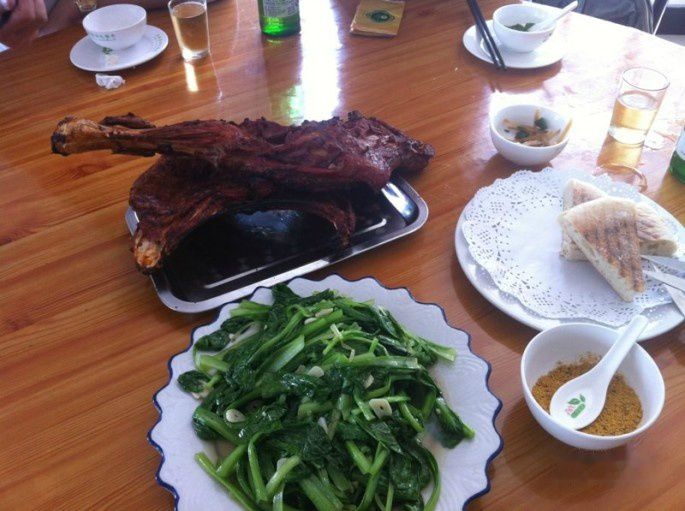 中 午,不容错过的黑山头烤羊腿和烤羊排大餐,要提前定的,应为烤的时间长,所以小陶提前1小时就帮我们定上,我们到了刚坐定,羊排和羊腿就上桌了,时间刚刚 好,羊排和羊腿烤得确实有水准,娇娇嫩嫩,看了就食欲大振,味道自然要比城市里好的多,因为新鲜嘛,再来点儿小酒,爽!