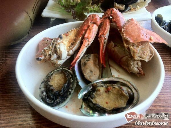 料很足,两个螃蟹,一个章鱼,一堆贝壳,大概十个鲍鱼,一堆虾,一共3万韩元