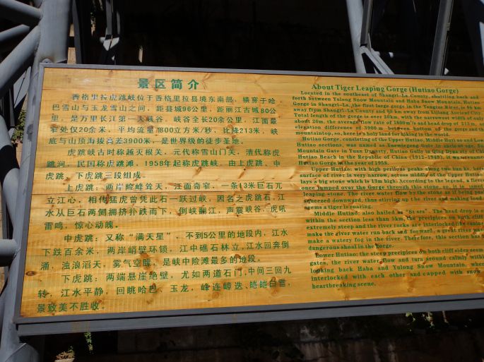 到虎跳峡,又可以分香格里拉虎跳峡和丽江虎跳峡之分。也就是说一个景点,在江的两岸观看。丽江进入,门票50元,相对来说丽江虎跳峡买票后还要走5公里,比较累,也有电瓶车,要收费。但只有一个虎跳,到不了中和下虎跳。从香格里拉进,门票65元,要走到江边栈道有点陡。但是年轻人基本选香格里拉进,可以徒步到中虎跳和下虎跳。迂回长25公里,东面为玉龙雪山,西面为迪庆的哈巴雪山,峡谷垂直高差3790米,是世界上最深的峡谷之一。峡内礁石林立,有险滩21处,高达10来米的跌坎7处,瀑布10条。 虎跳峡峡口海拔1800米;临峡一侧山体陡峭,几乎是绝壁,无路可寻;北岸的哈巴雪山临峡一侧山坡稍缓,这一侧有一条简易的碎石公路,贯通全峡,公路上方还有一条步行小路。 中虎跳离上虎跳5公里,江面落差甚大,“满天星”礁石区是这里最险的地方。百米峡谷中,礁石林立,水流湍急,惊涛拍岸。 从中虎跳过险境“滑石板”,即到下虎跳。下虎跳有纵深1公里的巨大深壑,这里接近虎跳峡的出口处,是欣赏虎跳峡最好的地方。