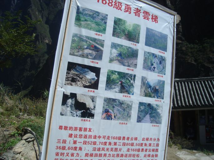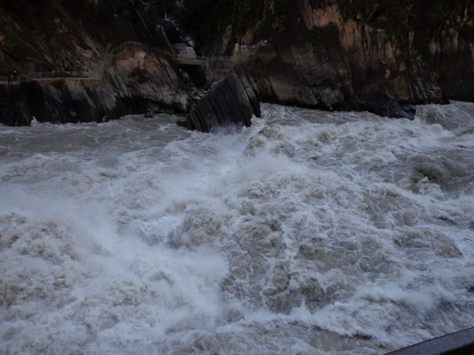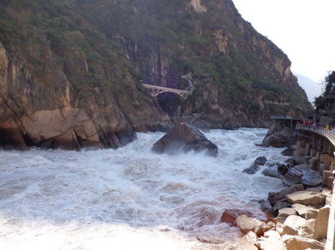这张图是下到峡谷底后可以上来的云梯,看图就头有点眩晕。上下来回据说3小时。中虎跳峡不仅深,而且窄,许多地方,双峰欲合,如门半开;游客身入谷中,看天一条缝,看江一条龙;头顶绝壁,脚临激流,心惊胆战。由于山岩的断层塌陷,造成无数石梁跌坎,形成江中礁石林立,犬牙交错,险滩密布,飞瀑荟萃。下午的太阳照亮了幽暗的深渊,撞碎的浪花闪现出七色的彩虹。任何落下去的物体都会在一瞬间变成齑粉。