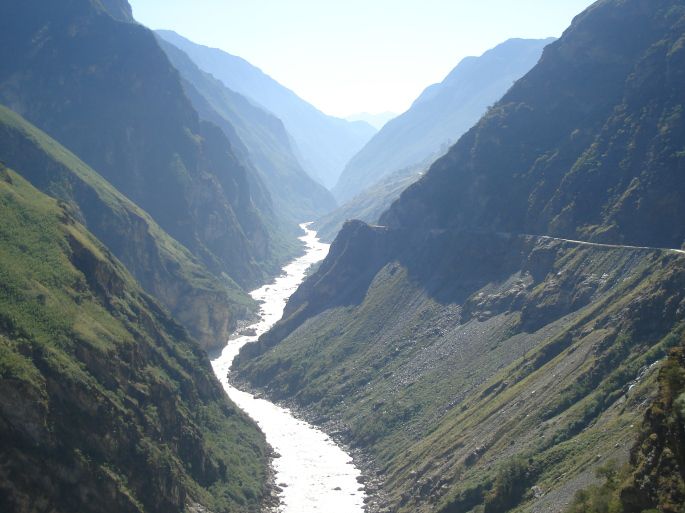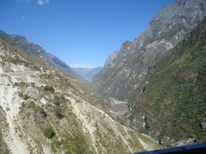 来到中虎跳,远观虎跳峡和艰险的盘山路。这里喝崖排空,或直刺青天,或斜扑江口。