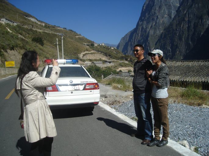 司机不肯走也有他的道理,我们体谅他。我们脱去外套,轻装上阵,不是只有5公里吗。其中一个小胖子不肯和我们去了。我们三人只拿了水和钞票甩开大步自己徒步!没走几步,顶多0.5公里吧,上面烈日灸烤,又要赶时间,一会就热汗直冒,衣襟浸湿。这时来了一辆警车,我实在是太想蹭车了,拦下警车,里面只有一个年轻人,非常热情的让我们上车了。通过交谈得知他是森林警察,藏族小伙健硕的象山中的猎豹。太好了!他还邀请我们到白水台,哈巴雪山骑马,真是好人!因为我们时间早就安排好,并且东西都在我们司机那里,所以谢绝了他的好意。刚上车不久一道大大的瀑布在道边悬在头顶,好壮观!一会到达中虎跳,告别好警察,再见谢谢您好心人!
