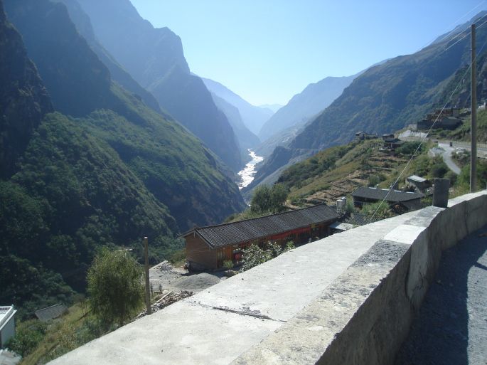 我们慕名去走中虎跳。当时司机不肯到中虎跳,理由是当地人做生意,不给汽车走。到当地还好,没有人阻挡。但司机还是不肯开车过去,从上虎跳边崖石下绕过去看公路确实非常危险,一条窄窄的水泥路盘着峭壁边,上边高耸入云的山峰连绵无边,下边万丈悬崖深不见底。