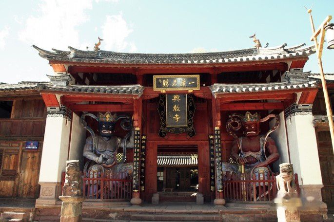 沙溪四方街东面有坐东朝西的古戏台,西面有坐西朝东的兴教寺,二者遥相呼应,将四方街平分为南北两半。四方街整个街场四周商铺马店林立,三条古巷道延伸到古镇的四面八方。 (沙溪:寺庙)
