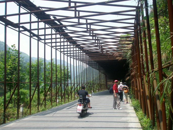 沿着公路走了约半小时,远见有一长亭,大家不约而同地走向那里。想借此休息顺便吃点东西填填饥,原本计划是到寨里吃午饭的,所以各自只带了些零食。