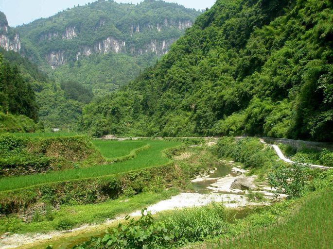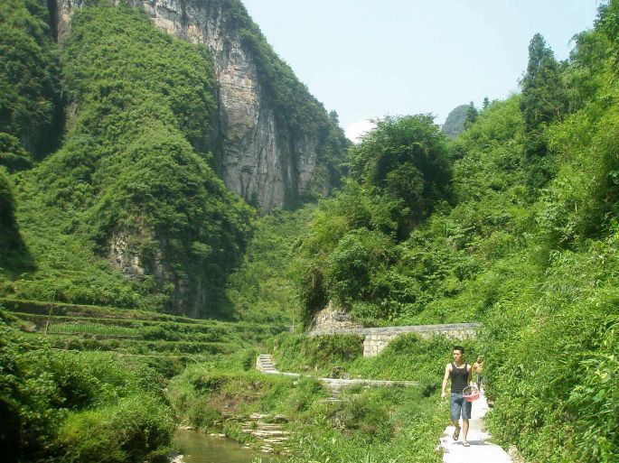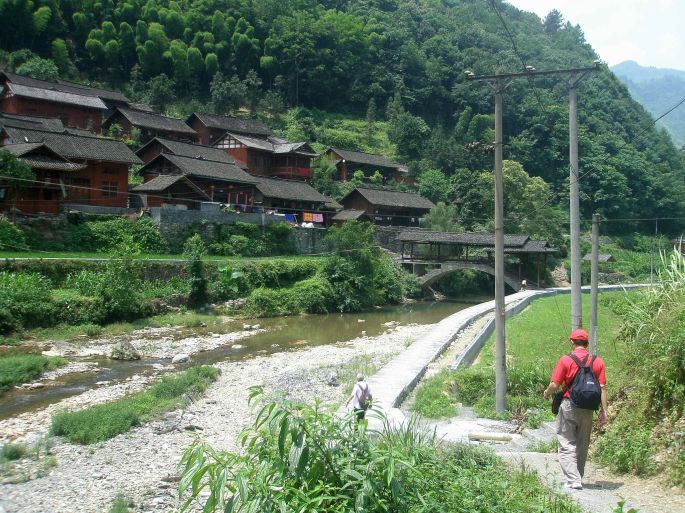 休息片刻后,见边上有条小路,问清当地人能通向苗寨的肯定回答后,当即改变主意,不走公路走小路,一来小路能遮荫,可以避开太阳直射的热辣,二来小路也许比公路会近些。