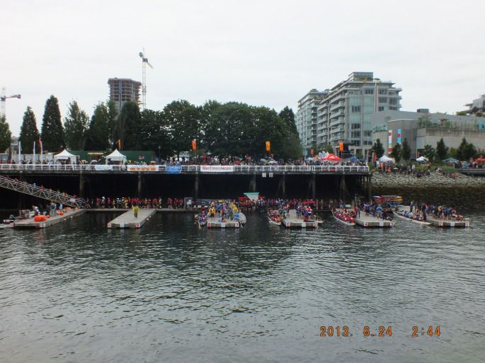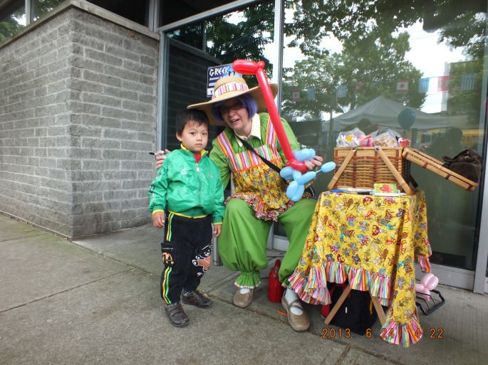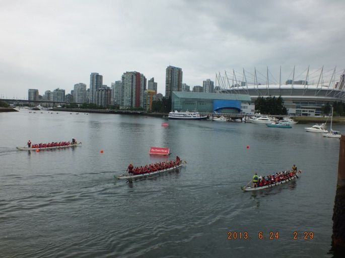 坐上天车到达看龙舟的地方已经有很多人了,我们站的地方是终点正好看到冲刺的精彩,比赛分组进行马上就要开始了,在国内由于我们是北方城市从来也没看过赛龙舟,只是从电视上看过,没想到在温哥华看到真实的赛龙舟了,其实赛龙舟是我们中国的传统,却在外国观看有点意思,选手们各个虎背熊腰精神抖擞地出发了,一会儿就到了终点,岸上的观众群情激动使劲呐喊加油助威,城城也跟着大喊加油,虽然语言不同,但激动的情绪是一样的,看了四组比赛决定赶往下一个景点看看,由于车票是有时间限制的超过一个半小时就要重新买票,所以我们加快了脚步但99路车刚刚开走,等下一辆及超时了。这也难不住我们,9路来了照上,时间只差一分钟,咋样瞧我们多能耐,自己表扬自己一下。本来我们想去最远的地方然后往回一路玩,但时间太长怕城城累着决定只去看希腊日的活动,远远就看见人山人海,路已经封了有警察在维持秩序,其实所谓的希腊日不过就是道路两旁买些希腊的服装和一些饰品,还有踩着高跷的滑稽小丑,还有免费小吃和饮料,小朋友最喜欢的是各种花样的气球,外国人特友善对小朋友可耐心了,问你喜欢什么就给你吹什么,怎奈咱不会英语无法交流,只会说道格小狗其实发音还不对,真是书到用时方恨少呀,不过人家大概也明白了给吹了一个小狗,蛮有意思的,还跟城城合了个影。