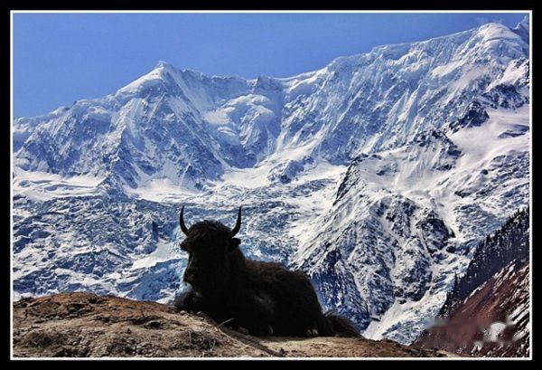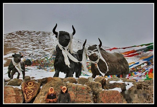 登上了米拉山口(海拔5013.25米),米拉山口是拉萨与林芝地区的分界山口。米拉山因其高大雄奇而成为此地藏民心目中的神山,山口上飘撒着许多祭山的经幡和印有经文的纸条,但在山口的最高处,矗立着一座标有“雪域之舟”的西藏耗牛石雕像。