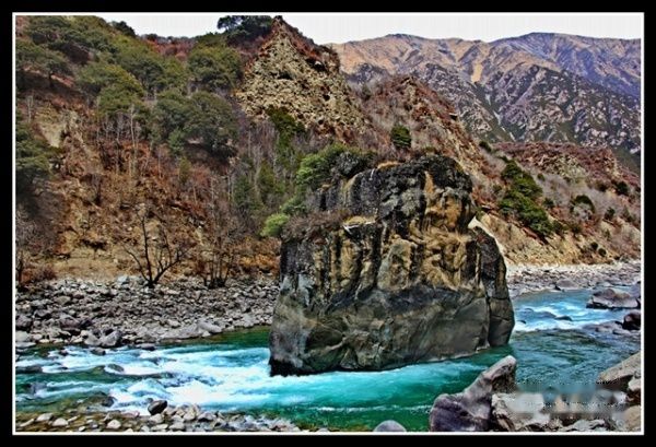 一路上沿着尼洋河河谷风光,来到了中流砥柱,山高沟深,河流湍急,为尼洋河第一大峡谷,江中一巨石兀然立于江中,背靠神佛山,相传这块巨石是工布地区的守护神-工尊德姆修炼时的座椅。