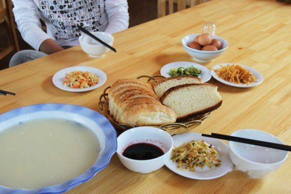 晚上住进了恩和的崭新木屋,吃过俄式晚餐后,那晚我们刚好碰上了有个游客点的篝火晚会,于是亮哥又带我们奔向那儿看晚会去了,走得匆忙,没带相机,所以没有留下照片了~晚会结束回来我意犹未尽,竟然叫上毛毛,大禹,欣欣,亮亮在旅馆的露天阳台对着黑夜中的草原唱起了“套马杆”,哇哈哈~~好过瘾~~因为旅游旺季,地处偏远,电压不够,没有热水,也没有暖气,冻了我一晚上,不过环境是最好的一晚~早饭是二米粥,牛奶,鸡蛋,俄罗斯列巴蘸蓝莓酱,小菜若干~那边的人基本上早饭都是这么解决的,早上都会喝现挤的新鲜牛奶~味道不错~~