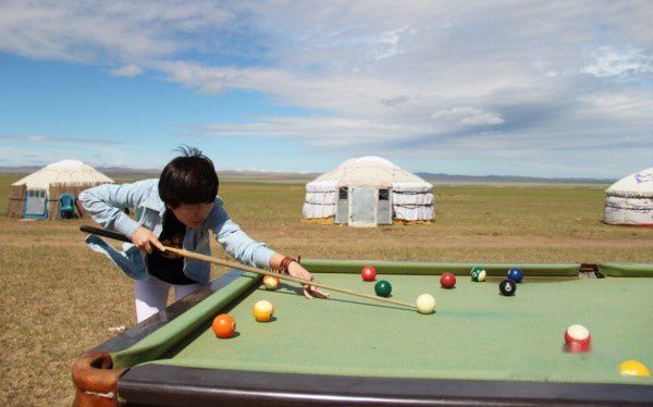 牧民们的生活并没有我们想象中的单一,人家的娱乐绝不止骑马,射箭,摔跤这么简单,这不还有桌球么~~他们每年蒙古族都有那达慕大会,只是具体时间都不一,要遇上很不容易~~