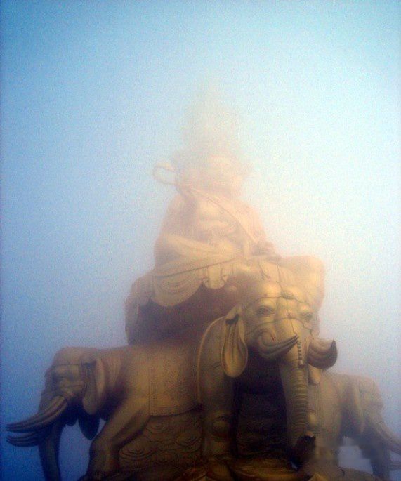 四面佛是峨眉山上新建的景点,供游人朝拜也是金顶的新象征。可惜,我们是在正午时间到达没能看到“金顶日出”,天气不好也没能看到大名鼎鼎的佛光。不过那层层叠叠的云海还是很壮观的。两天一夜的峨眉山游就这样结束了。