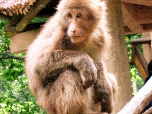 离开“清音阁”顺着“一线天”往前走,就是著名的峨眉山猴子集散地。早就听说峨眉山的猴子不怕人,甚至很勇猛。我们吸取了前人的教训,避免穿鲜艳的衣服和大喊大叫刺激它们,只想“悄悄的进村,打枪的不要。”没想到,我们还是被猴子给狠狠的“戏弄“了一番。路 过猴子们的“根据地”时,前后左右都有一些训猴人拿着棍子在“保护”,耳边不时传来猴子们的嘶叫和游人们的尖叫……有不少人因为带了猴子们喜欢的小玩意、 或者好吃的、或者不小心把猴子们惹恼了被抢包的抢包、抢吃的抢吃、爬上身的爬上身……看得我们是越来越怕,只能躲在路边悄悄的走。现在的猴子啊,占据一方 山头,走过路过都要留下买路钱。突然,一阵风 从我们头顶刮过,就听见旁边的朋友一声惊呼。我们抬头一看,一只肥肥的猴子正安然坐在路旁的石头上,左爪握着朋友的冰红茶右爪正扭着瓶盖。“晕,现在的猴 子都会开瓶盖了!太强了!”朋友气归气,但是我们可不敢惹它。据说,如果打了一只猴子,会有一群的猴子来找你的麻烦……