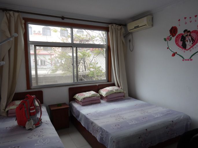 房间有一张双人床和一张单人床,属于家庭间。总的说来,房间布置比较简单,有一些必要的设施。如空调机(这个天气不用开所以没试用)、电视、电热水壶和一个衣架。电视柜上有一些灰尘,老板很快拿抹布帮我们清理,这也是家庭旅馆的风格吧(虽然不像连锁酒店有严格的服务标准,但老板很热情)。客房有独立的卫生间,可以淋浴。(沐浴用的是太阳能热水器,入住当天不知是因为阴天热水少还是出了故障,房间内没有热水。好在老板自己家还有个单独的太阳能,让我们在那里洗了澡。)