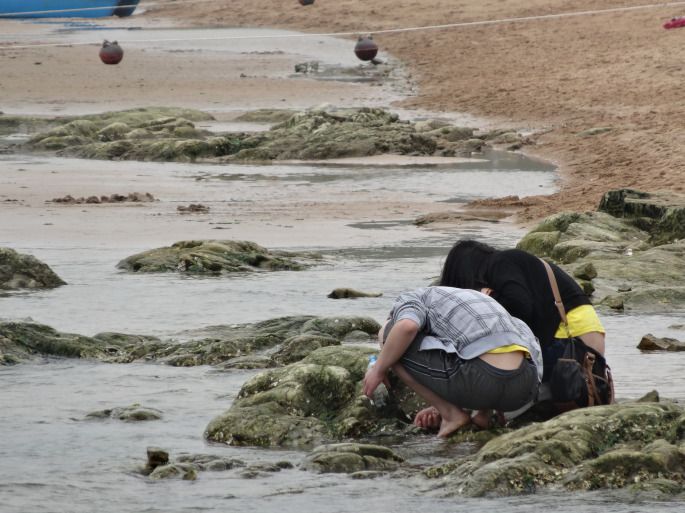 从珊瑚展馆出来就到了著名的鸽子窝海滩,已经有不少人了,很多人拿着瓶瓶罐罐抓小螃蟹、小虾,还有用小网抓鱼苗的,有一些收获颇丰哦。