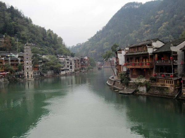放眼望去,一层层、一排排粉墙黛瓦的亭台楼角,木结构的吊脚楼和古城门、城墙相互依偎,错落有致地分布在沱江两岸,构成湘西独有的风貌。