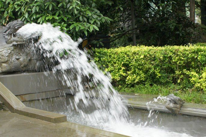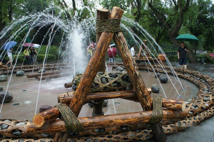 一进都江堰景区大门,我们率先看到的就是非常有特色的杩槎喷泉造型,这里也要解释下[杩槎]的含义,它由杆件扎制成支架,中加横杆铺板,内压块石或混凝土块等重物,用以截流或导流的一种中国古老河工建筑物。