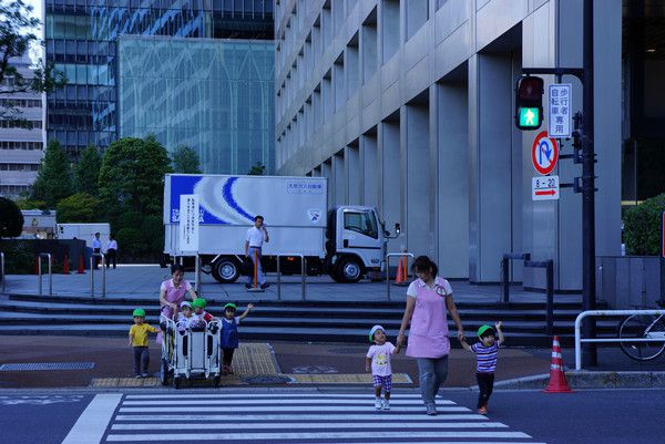 好可爱的小朋友们。日本的小朋友们都带帽子诶!好Q,还坐在手推车里一起过马路。