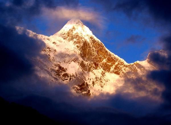 回到旅馆,院子里多了几辆越野车,一些专业设备正在不断搬下来,老板告诉我们这是一个风景摄制组,来这拍南迦巴瓦的日出日落,今天已经第十天了,一直没等到。等我们洗完脸从楼上下来的时候摄制组已经长枪短跑全部摆好,南迦巴瓦还是云雾蔽日,时间已经快晚上7点了。我们坐在饭厅里正点菜,外面忽然一阵骚动,跑出去一看就呆了,南迦巴瓦前面的云已经散了,一座棱角分明的金黄色山峰就这么不真实的出现在我们面前,我像是看海市蜃楼又像是经历一场梦境般看着眼前这座云中的天堂。我的人品真有那么好吗?要知道这是我在直白唯一的一晚,就让我看到了别人等了一个星期都没看到的南迦巴瓦落日?看来我要对自己的人品重新评估了。
