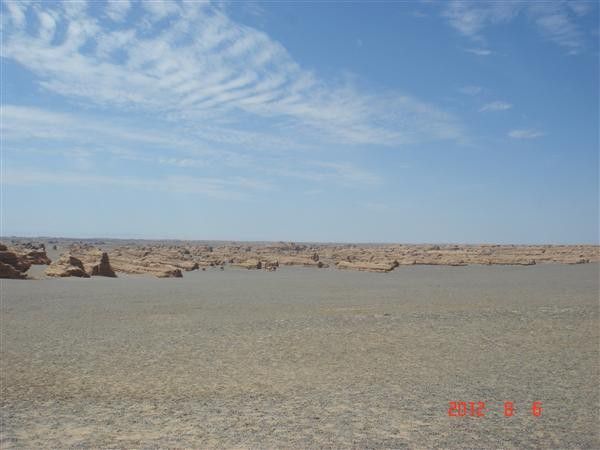 还是赶路吧。从这里到玉门关还有40公里、到雅丹还有100公里呢。车跑在路上,眼前戈壁滩与天相接,昨天的那场雨似乎原来就蓝的天空洗涮了一次。坐在车上看着无边的大漠,给人予无限的遐想与感慨。