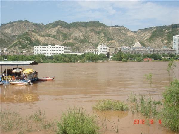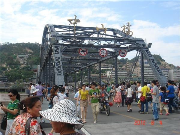 对南方游客来说,羊皮筏应该是兰州唯一有特色的旅游项目。乘坐羊皮筏的地点就在黄河母亲雕像处,这雕像,司机都知道。我们到的时候,碰上兰州下了几天雨,黄河涨水了,原来河滩边上的那些大排档都淹了,由于水流较急,羊皮筏原来的终点是在中山桥附近,漂到那里正好去游白塔山公园。现在起点改成终点,快艇把我们连同船工工、羊皮筏子一起送到上游一个水流较缓的位置,小心奕奕地从快艇跳上筏子,之后就开始漂流了。其实也就是顺流而下。一个筏子大约由8只羊的羊皮组成,每个羊皮充气之后就象一只小羊,圆滚滚。城里的小孩没见过,以为是小猪。旁边的师傅提醒别乱说“猪”什么的,有些船工是少数民族。这是第一次上了一堂民族风情课,此后8天的旅程,我们不时提醒自己不要说那个字。
