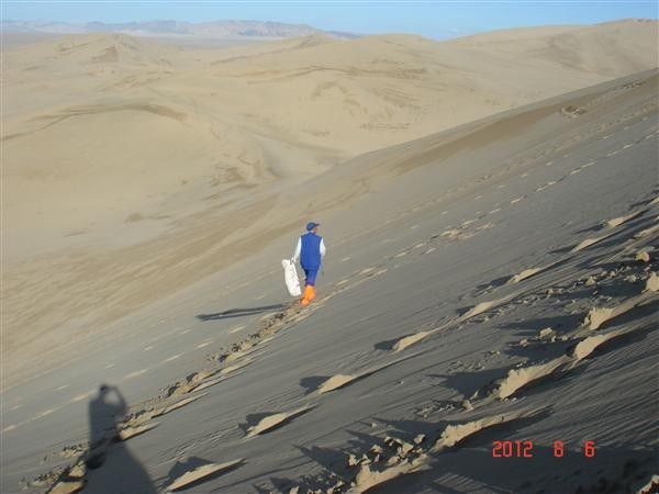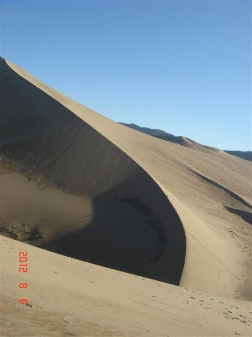 正在感叹爬山之苦时,旁边走来的一个清洁工,我追着他,一边走一边聊天,老人已经62岁了,工作是清理沙游客扔到沙山上的垃圾,每天要在山门与月牙泉之间的走六七个来回,不服不行。老人家说,骑骆驼是有钱人的玩意儿,真正的好风景还是在这里,你到了山顶就知道了。说着,对面山梁上两个年青人随手扔出一个矿泉水瓶,瓶子在空中翻了个跟斗,落在山腰上。老人家很生气地说,什么人呀,都马上要到山顶了,还往山腰里扔?说着,纵步斜穿,往山腰走去。我则奋力向山顶冲刺。