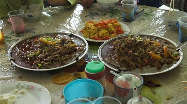午餐是在路边的一家回族餐馆吃的。老板很实在,向我们推荐了3斤羊肉,一碟西红柿炒鸡蛋,外加面食。3斤羊肉,吃得个个叫好、回味无穷。这也是西行几天来吃得最爽的一次。水足饭饱,继续上路。这时已经明显感觉到天气开始变凉了,大家在车上就开始加衣服了。