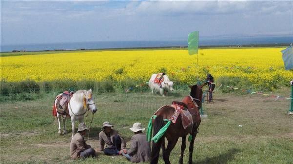 进入青海湖的路上,都是环湖骑自行车的人。公路的两边是大片大片的油菜花,还有不少人藏民拉着马匹在自家的油菜花地里拉客。虽然有很多攻略都提到,千万别乱进去,这里的藏民很野蛮,进了就得收钱。但再往前走,我们还是忍不住下来,拿望远镜看前边的青海湖。这时就有藏民过来问要不要骑马?30块钱可以带着跑一圈。一圈?如果真绕着他们家的油菜花地跑一圈,路程也不短,几个小家伙就动心。由于我们一车人都下来了,这下不得了,一下子围五六匹马,价钱也降到25元。两个小家伙乐滋滋地上马了,我们的麻烦也来了。一个骑在马上的30几岁藏民说:进菜地要另外收门票钱,一人10元。刚开始语气还好些,几次理论下来,就变得很凶了:20元一个,不给就别想走!看那阵势,旁边又围了几匹马过来。好吧,咱不吃眼前亏,很不情愿地给我40元。再看两孩子骑的马,什么绕一圈?!就是路边这么十几米的地方,走了两个来回!难道这就圣洁青海湖的待客之道?什么都不说了,上车走人。