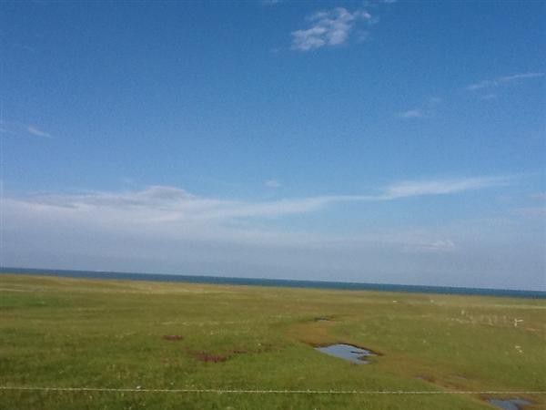 到黑马河已经是5点半钟了。安置好行李,我们就租4辆自行车“环湖”游。司机告诉我们国道右拐没多远就可以骑到湖边。我这个领队没搞清楚就稀里糊涂地领着大家骑开了。网上说黑马河乡至石乃亥乡(鸟岛)41公里的环湖西路是青海湖最美的路段。沿着环湖西路,我们一路向前,也确信网上所言非虚,这里车比较少,路很平,偶尔有几个上坡路段。但越往前骑,发现离湖越远,赶紧调头。在离国道不到1公里的地方,有条一车道的水泥路通往班禅喇泽旅游景点,这个景点是免费的,湖边有很多的帐篷,应该有不少驴友选择住这里,方便第二天早上看日出。网上说,这里是观看青海湖日出的最佳地点之一。等我们赶到湖边时,天色将晚,晚霞下的青海湖,象浩瀚的大海,湖水不时掀起一阵阵浪潮,轻轻地涌向岸边。但这里毕竟是湖不是海,冲力不是很大。孩子们在岸边奋力地往湖里扔石头比赛,大人则安静地站在那里感觉圣湖的灵气……