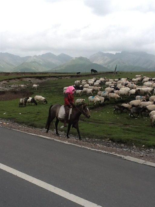 去倒淌河要经过日月山,司机说,山上就两座亭子,如果真要看的话,就拐进去。看看时间,2点多,想着下一景点可能更好玩,大家一致同意不上日月山。司机为了“补偿”我们,带我们走了一条小路,路上可以看到漫山遍野的羊群、几队牦牛群。这才是我们想要的。这里的海拔已经有3000多米了,呼吸明显有点困难。看着这么多的羊群,大家正好都下车来喘口气。一位女牧民在路边摆着一小摊,上面放着一些新鲜的黄蘑菇。据说这种茹的营养价值很高,当然啦,价钱也不便宜。