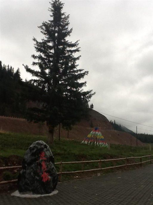 就这样边走边玩,在进入祁连山脉前,天空已经变色,先是小雨点,后是着豆子大的雨点。司机直叫麻烦了,不知道山顶是否会下雪,要不打道回府?下雪?大家都兴奋了,向前!向前!车到最高点冬树山垭口,这里的海拔4177米,雪没有下,雨大、雾大。打开车门,冻得直哆嗦。本来想站在那里留个影的,但谁都不愿意下来,我将儿子喊了下来,到了这么高海拔的地方,无论怎么说都得站一站,这是我们到过的海拔最高的地方了。