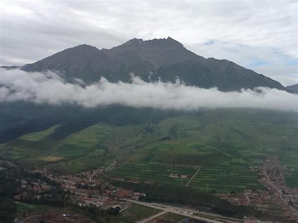 这应该是祁连县的制高点了,虽然这山不是最高的,但视野比较开阔。山脚下就是祁连县城,周围则是高山环绕,在“天境祁连”石碑的正前方就是有名的“牛心山”。从卓尔山上看,处处美景,成片的青稞地顺着山势起伏不断的向远处延伸,再往上就是森林、牧场和成群的牛羊,偶尔一阵白云飘过,恍如置身仙境。只要不是盛夏,牛心山的山顶都残留着冰川,但现在已经没有了。用高倍望远镜看,只看到山顶呈灰色,山顶往下到森林草原处则有一条冲刷得洁白的沟渠,这可能是冰川融化后流往山下的雪水,那条白色的带状,没有一丝中断,可能正是山顶冰川仍在融化的结果。