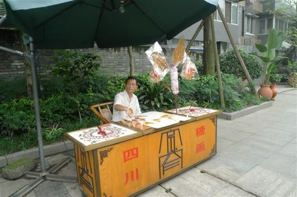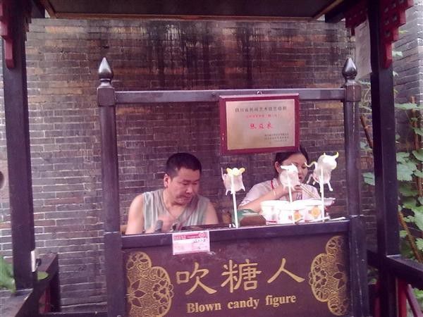 锦里就在武侯祠旁边,因为孩子还小,妈妈们对三国不感冒,所以我们直接去了旁边的锦里。它也是条商业街,里面一条街道卖各种工艺品,一条街道卖小吃。当时宝宝就买了蛋烘糕和油炸果子。晚上五点没来得及看锦里进口左手第一家茶楼的变脸,说是30元/位。我们决定有时间再来看。锦里的吹糖人。