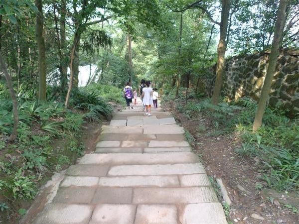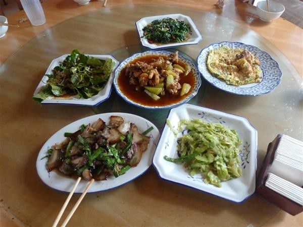 我们一下车就有卖冰糖李的人过来,最后说好7元一斤还蛮甜的。到了农家乐中餐就在她家,可能是我们让打八折,结果全是小碟装菜。除了一个蒜苔炒肉的蒜苔嫩点,其他如白果炖鸡说是青城山的名菜,也没有几块鸡肉,味道也不咋的。我们中午睡了一觉,下午一点出发去登青城山。