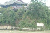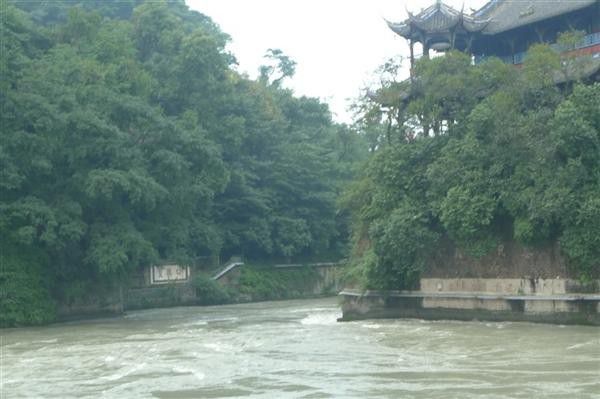 照样蹭听,然后照集体照。听导游在旁边解说:这个是用形似鱼嘴的堤坝,把岷江水一分为二,在我们左手边是外江,右手边是内江。现在的鱼咀已是钢筋混凝土建筑,在从前它可是土石做基,用卵石竹笼护堤。由于这段河道的河床外高内低,再加上正有一个弯道,所以鱼咀分水后在春耕季节江水流量较小时,主流就有约六成的水进入内江,首先保证了成都平原的农业灌溉用水。洪水季节,流量急增,水位大幅度提高,水势受河床弯道的制约明显减少,再由于外江一侧江面较宽,内江―侧江面较窄,内江的流量会自动低于外江,进水约四成,这样又在很大程度上解决了成都平原的防洪难题。这种功用便是都江堰三字经中所说的“分四六、平潦旱”。根据弯道环流原理,江水在弯道产生的漩流,会将下层的沙石卷到水流上层,大部分便自动被带入外江一边而不进内江。鱼嘴正处于“正面取水”“侧面排沙”的理想位置。80%的沙石从这里排走,大大减少了内江淤塞之害。