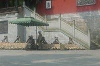 我们往回走过著名的安澜桥去二王庙逛逛,安澜桥更长更摇晃,不过只要走中间,反而比在旁边拉着绳子走得更稳,宝宝还在上面用跑和跳的。过了桥和另一个妈妈走不动就在下面休息,最后由另两个妈妈带四个孩子去了二王庙。在各个景点都见的古装铜人,合影要收费: