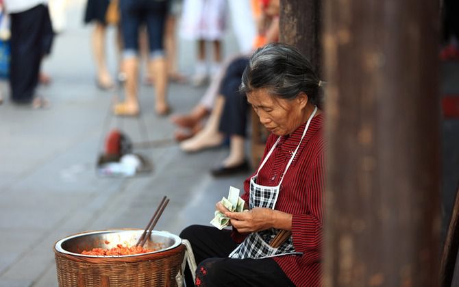 卖小吃的大妈已经开始在整理她的收获了。