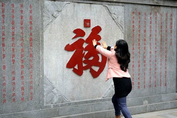 抓拍正在摸福的游客