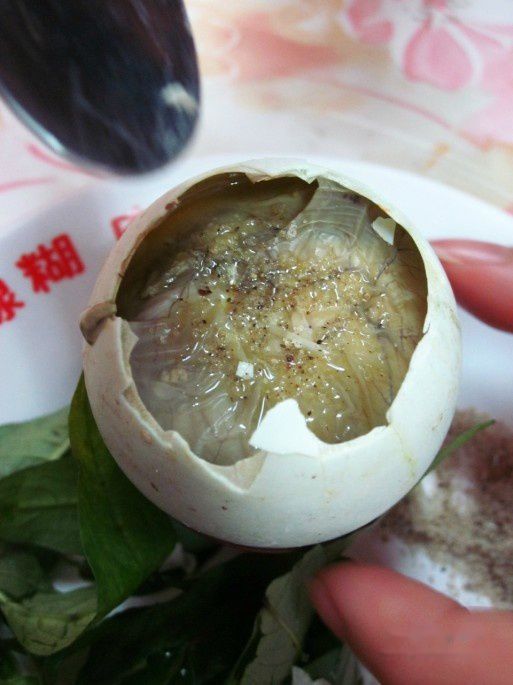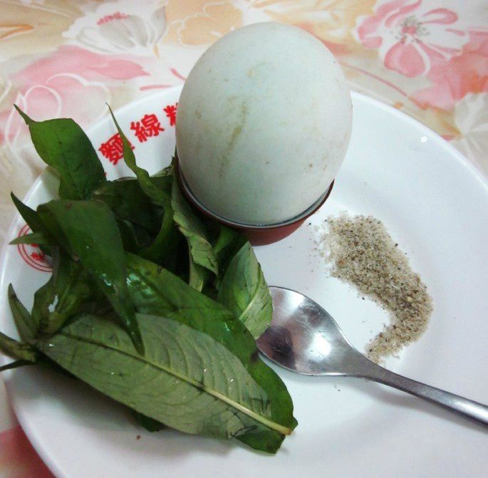 吃法就是要在蛋上敲一個洞,然後用湯匙去挖,再沾旁邊的胡椒鹽夾著特別的葉子配合著吃,但有點腥味口感有點粉粉的,葉子的味道就是…類似九層塔的感覺但是味道完全不一樣…就是有特別的香味…有點難形容,如果你問我為什麼不放一張挖出來的照片,我會告訴你…你還是別看比較好。