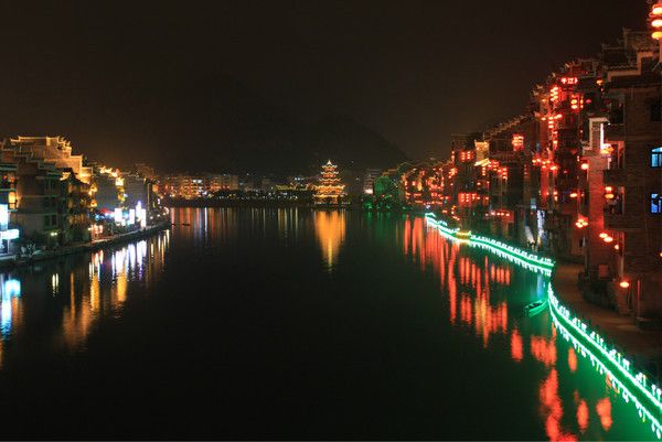 傍晚的大新桥下,许多沿河的餐馆都有露天的餐桌,可以边享用美食边欣赏夜景。用完晚餐后,可以从大新桥,古镇步行街,祝胜桥,青龙洞,河堤北岸(可沿河步行,遍布酒吧餐馆),最后回到大新桥走一个环线,路程适中,但是足以领略镇远最美的夜色。